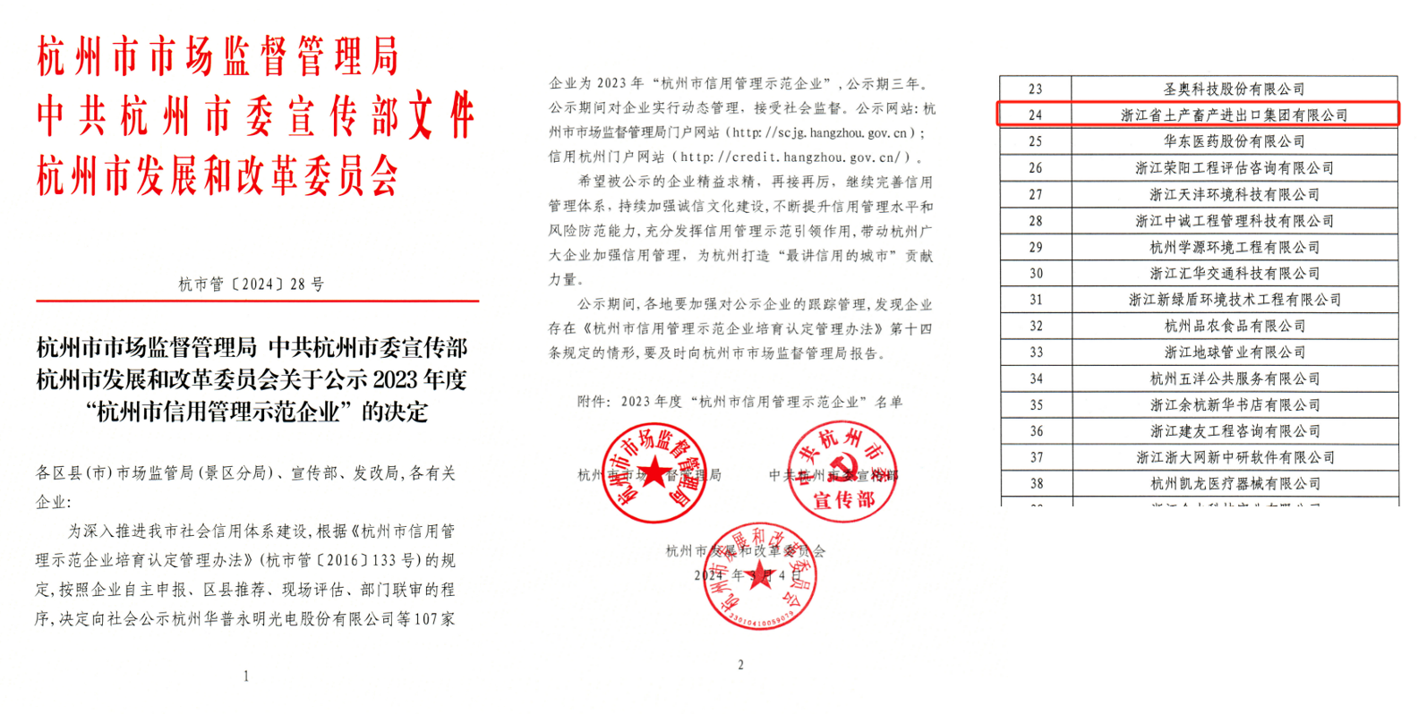 浙江土畜榮獲2023年度“杭州市信用管理示范企業”稱號