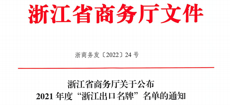 近日,浙江省商務廳公布了2021年度“浙江出口名牌”評選結果。經過材料組織遞交、專家審核、相關部門意見征求、社會公示等6個多月的申報評審流程,…