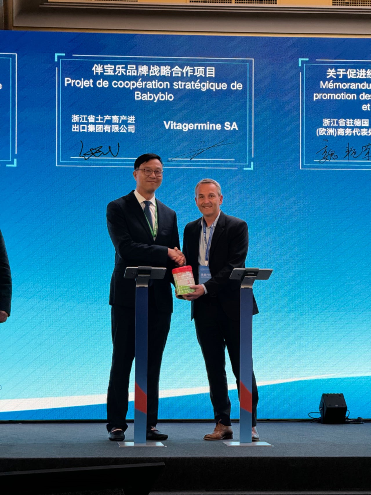 5月13日,浙江土畜參加浙江-巴黎大區高新產業創新合作對接會,與“伴寶樂”母公司法國創機然開展戰略合作洽談。在浙江省委易煉紅書記、集團領導的見證下,張斌與伴寶樂CEO Ludovic BEGUE先生簽訂品牌戰略合作項目,未來5年浙江土畜向法國創機然公司采購進口“伴寶樂”乳制品及嬰幼兒輔食產品1億美元。在法期間,張斌隨高秉學董事長拜訪法國創機然公司總部,前往伴寶樂位于法國南特的奶粉工廠考察,對法國乳制品、嬰兒奶粉等市場進行調研。作為法國高端有機嬰幼兒食品第一品牌,法國創機然公司不僅樹立起在歐洲有機乳制品領域的標桿,同樣引領著世界綠色產業發展方向,浙江土畜與法國創機然公司的深度合作將極大提升中國企業在有機食品領域的發展進程。