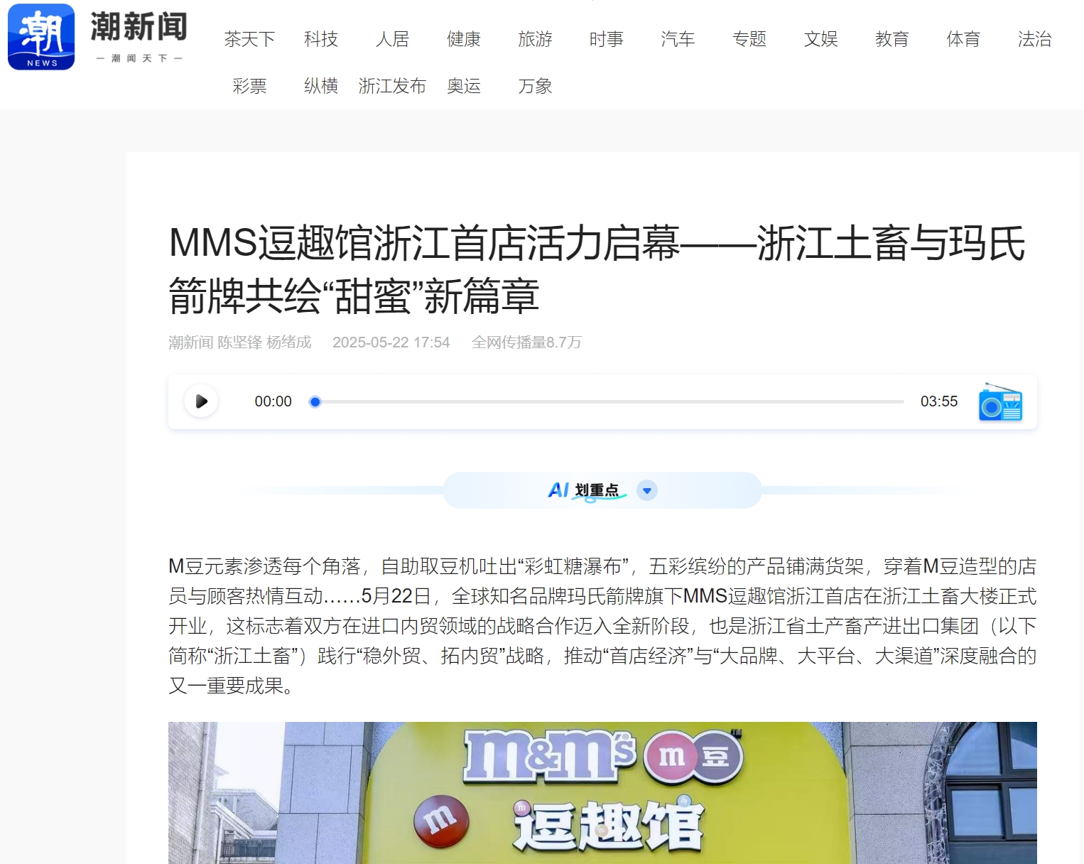 5月22日,全球知名品牌瑪氏箭牌旗下MMS逗趣館浙江首店在浙江土畜大樓正式開業(yè),這標(biāo)志著雙方在進(jìn)口內(nèi)貿(mào)領(lǐng)域的戰(zhàn)略合作邁入全新階段,也是浙江省土產(chǎn)畜產(chǎn)進(jìn)出口集團(tuán)踐行“穩(wěn)外貿(mào)、拓內(nèi)貿(mào)”戰(zhàn)略,推動(dòng)“首店經(jīng)濟(jì)”與“大品牌、大平臺(tái)、大渠道”深度融合的又一重要成果。MMS逗趣館浙江首店落地獲中新社浙江分社、潮新聞、今日長三角等多家媒體關(guān)注報(bào)道。