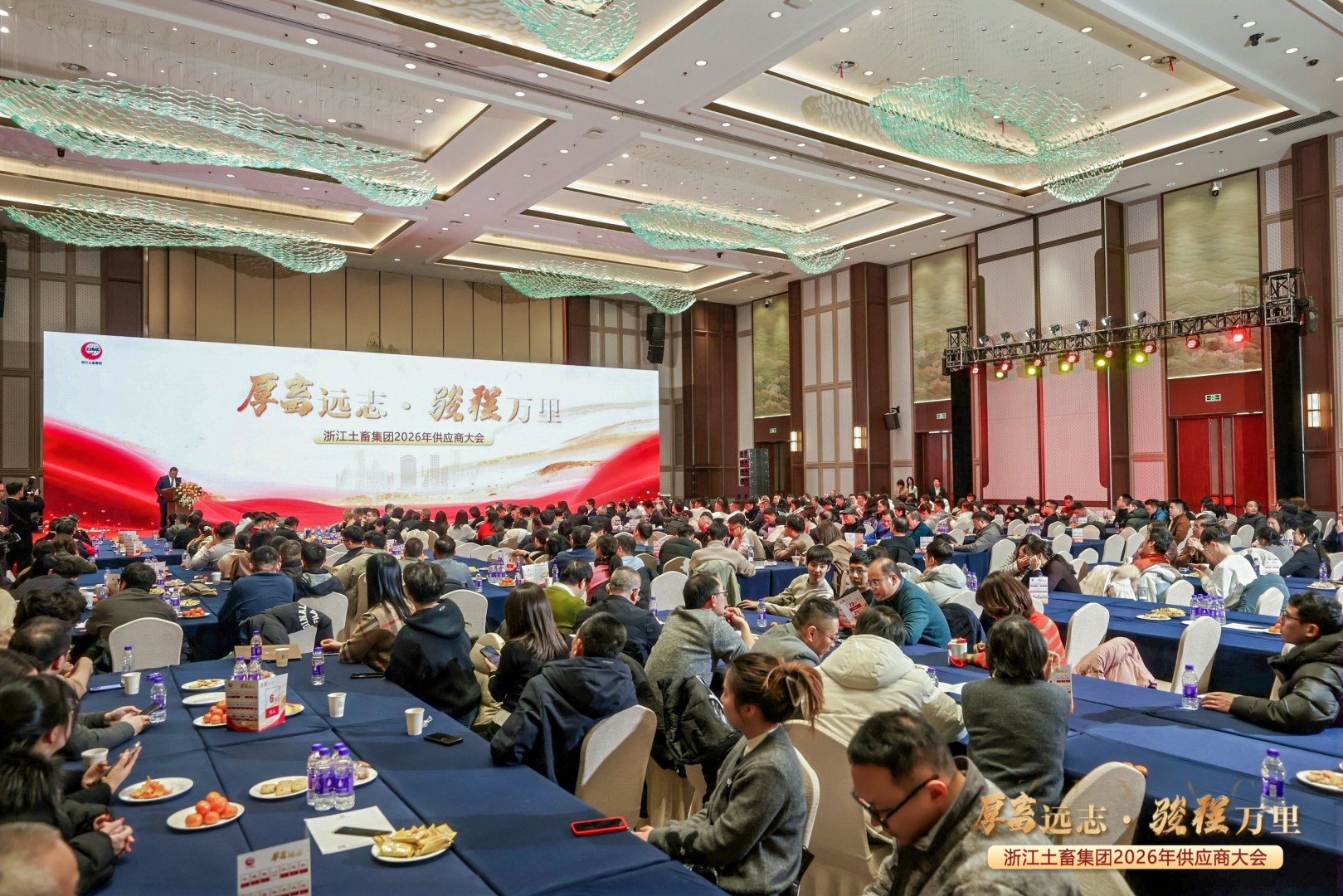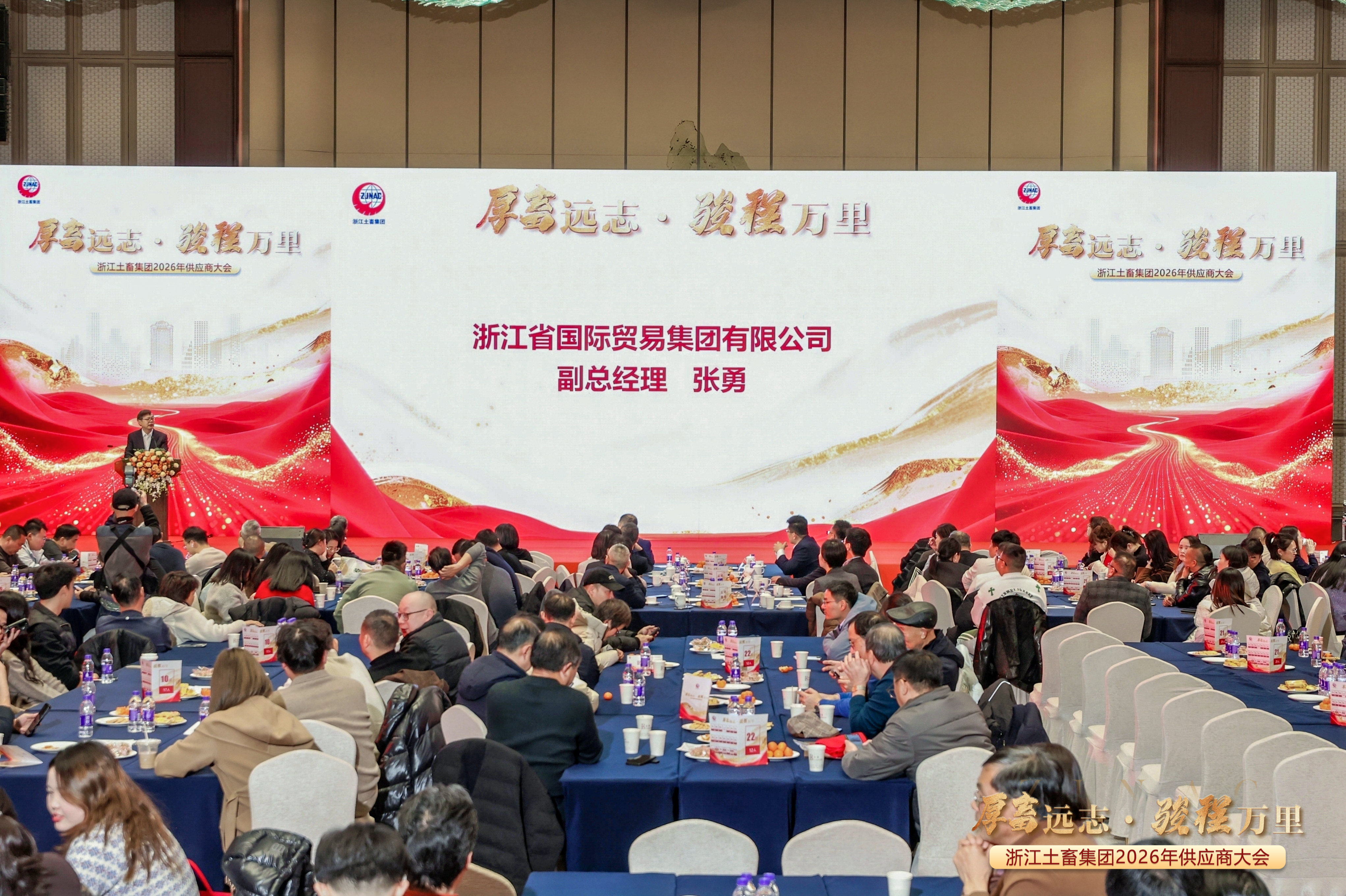 1月21日,浙江土畜在杭州舉辦2026年供應(yīng)商大會(huì),來自全國(guó)149家企業(yè)的300余位供應(yīng)商和業(yè)務(wù)員代表們齊聚一堂,共謀合作新篇。省國(guó)貿(mào)集團(tuán)副總經(jīng)理、黨委委員張勇,商貿(mào)部相關(guān)負(fù)責(zé)人應(yīng)邀出席,公司領(lǐng)導(dǎo)班子、各部室參加。