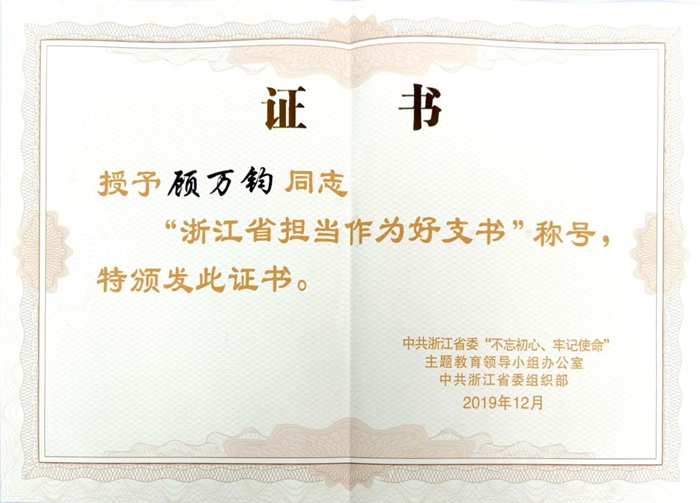 大會表彰了300位全省各領(lǐng)域基層黨組織帶頭人中涌現(xiàn)出來的先進(jìn)典型,浙江土畜集團(tuán)惠隆第二黨支部書記顧萬鈞同志被授予“浙江省擔(dān)當(dāng)作為好支書”的榮譽(yù)稱號。