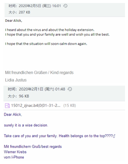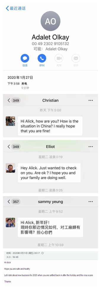作為業(yè)務(wù)一線的業(yè)務(wù)部門,業(yè)務(wù)六部的客戶分布在美國(guó),德國(guó),意大利,荷蘭等國(guó)家,在得知疫情的第一時(shí)間,各種問(wèn)候的郵件就雪花片一般地飛來(lái),因?yàn)榧倨谠诩遥瑯I(yè)務(wù)員沒(méi)有第一時(shí)間看到郵件,客人就通過(guò)微信,甚至直接電話前來(lái)詢問(wèn)是否平安。
