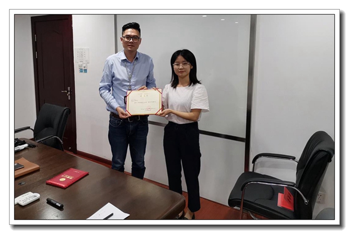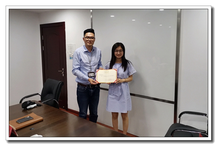 人力資源部孫陽瑯向鄭夢莎頒發(fā)優(yōu)秀學(xué)員證書