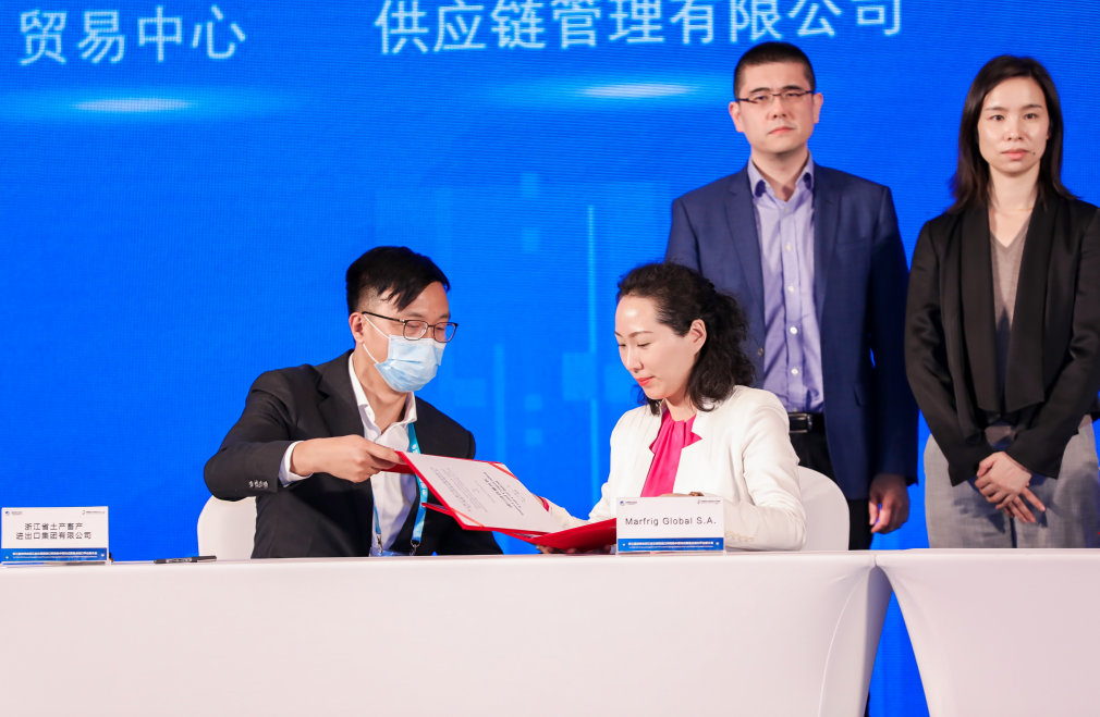 開展首日,浙江土畜參加浙江首批進口采購簽約活動——浙江歐洲數(shù)字經(jīng)濟與高新技術(shù)產(chǎn)業(yè)高峰對接會,與巴西肉類出口龍頭企業(yè)BRF公司簽訂3000萬美元豬肉和雞肉進口合同。11月6日,浙江土畜先后參加省交易團進口采購集中簽約儀式、省重點平臺推介會,分別與西班牙Litera Meat,巴西、烏拉圭Marfrig簽訂1500萬美元豬肉和1000萬美元牛肉進口合同。