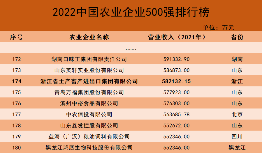 12月15日,2022年度中國農業企業500強榜單發布,浙江土畜集團位列第174位。