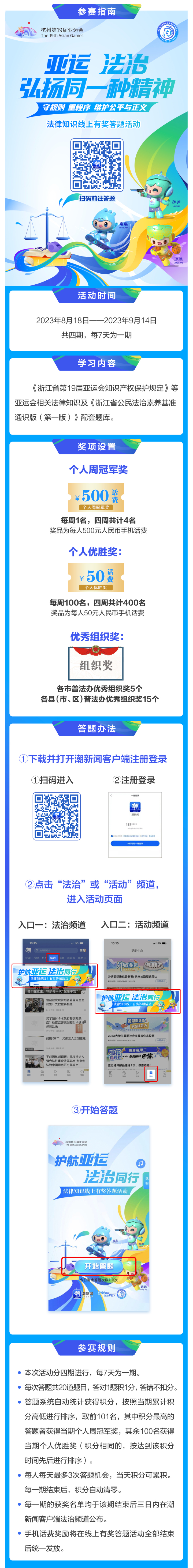 亞運(yùn)法律知識(shí)線上有獎(jiǎng)答題活動(dòng)已于8月18日在“潮新聞”客戶端正式開(kāi)啟,具體情況如下: